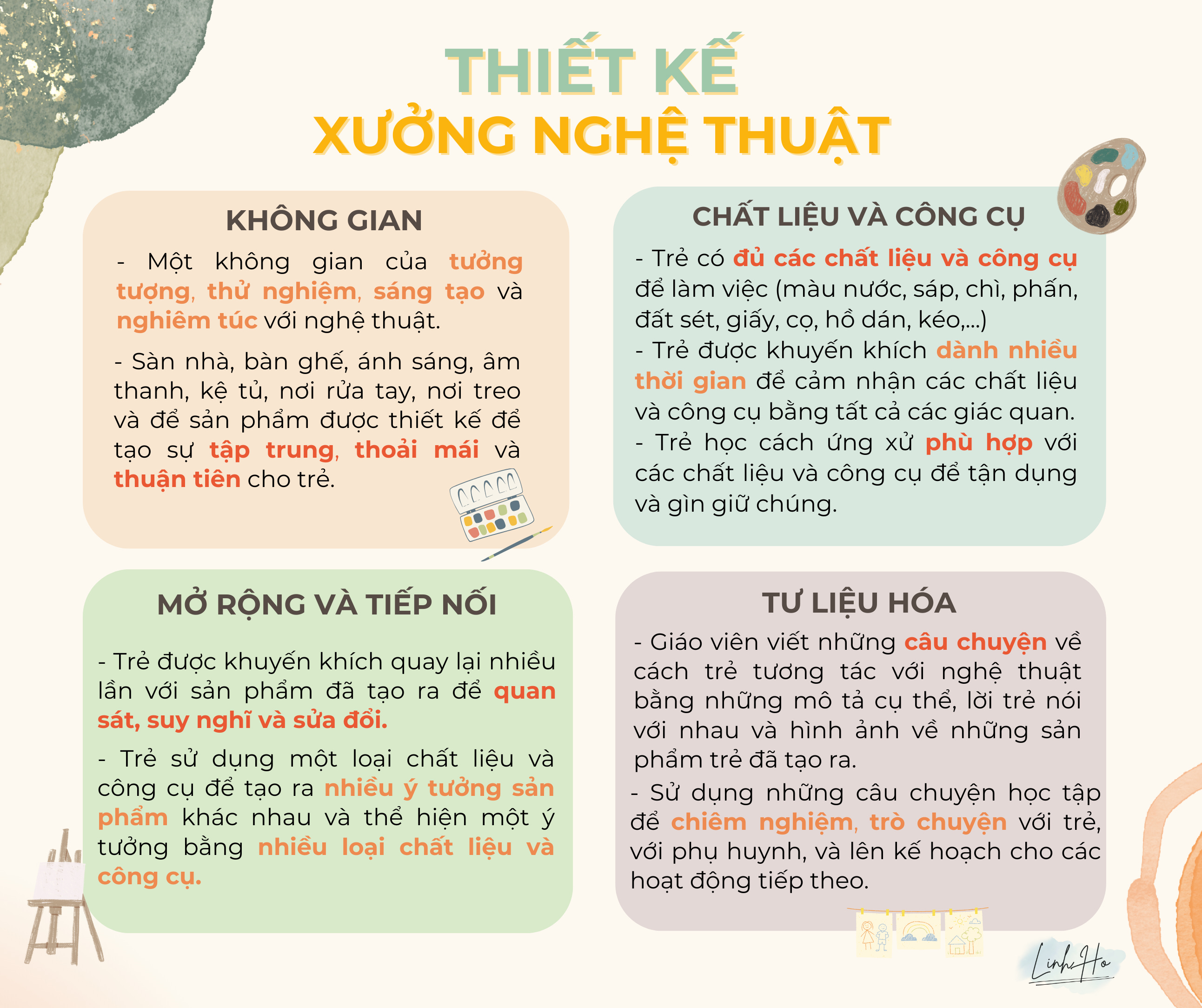 Xin gửi tặng Ba Mẹ và các Thầy Cô 4 điểm lưu ý về xây dựng xưởng/studio nghệ thuật/atelier mình đã tổng hợp dựa trên ý tưởng và các nguyên lý của tác giả Ann Pelo lấy cảm hứng từ tiếp cận giáo dục Reggio Emilia.