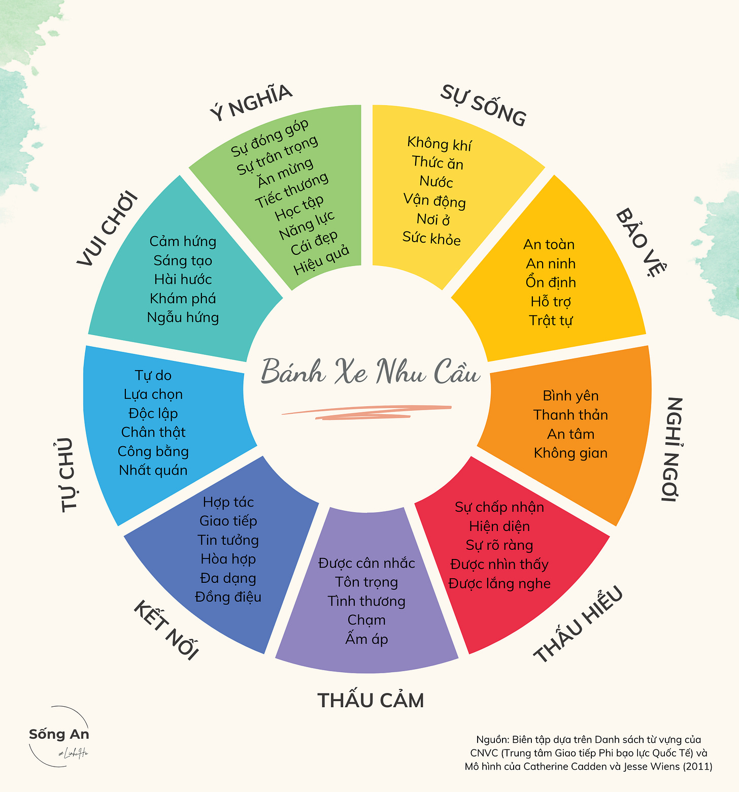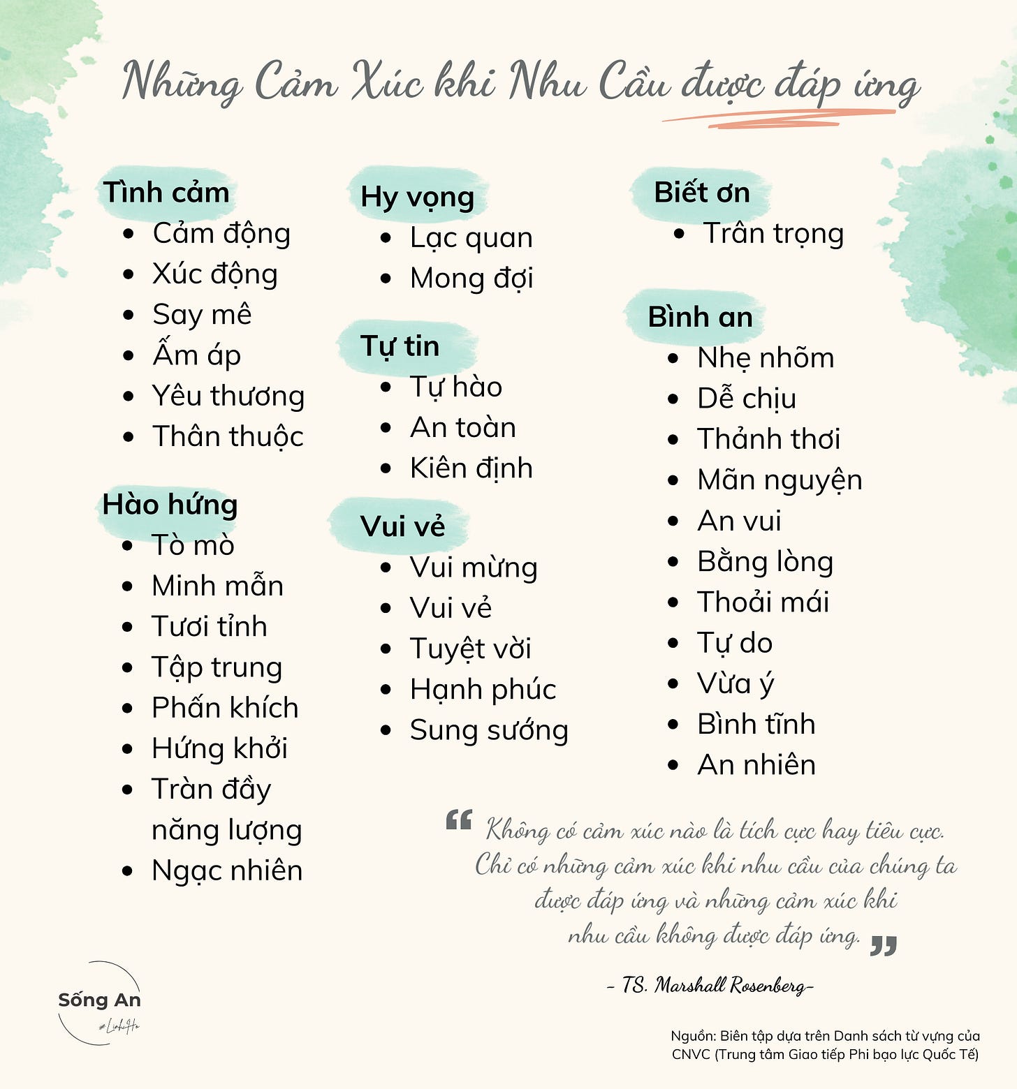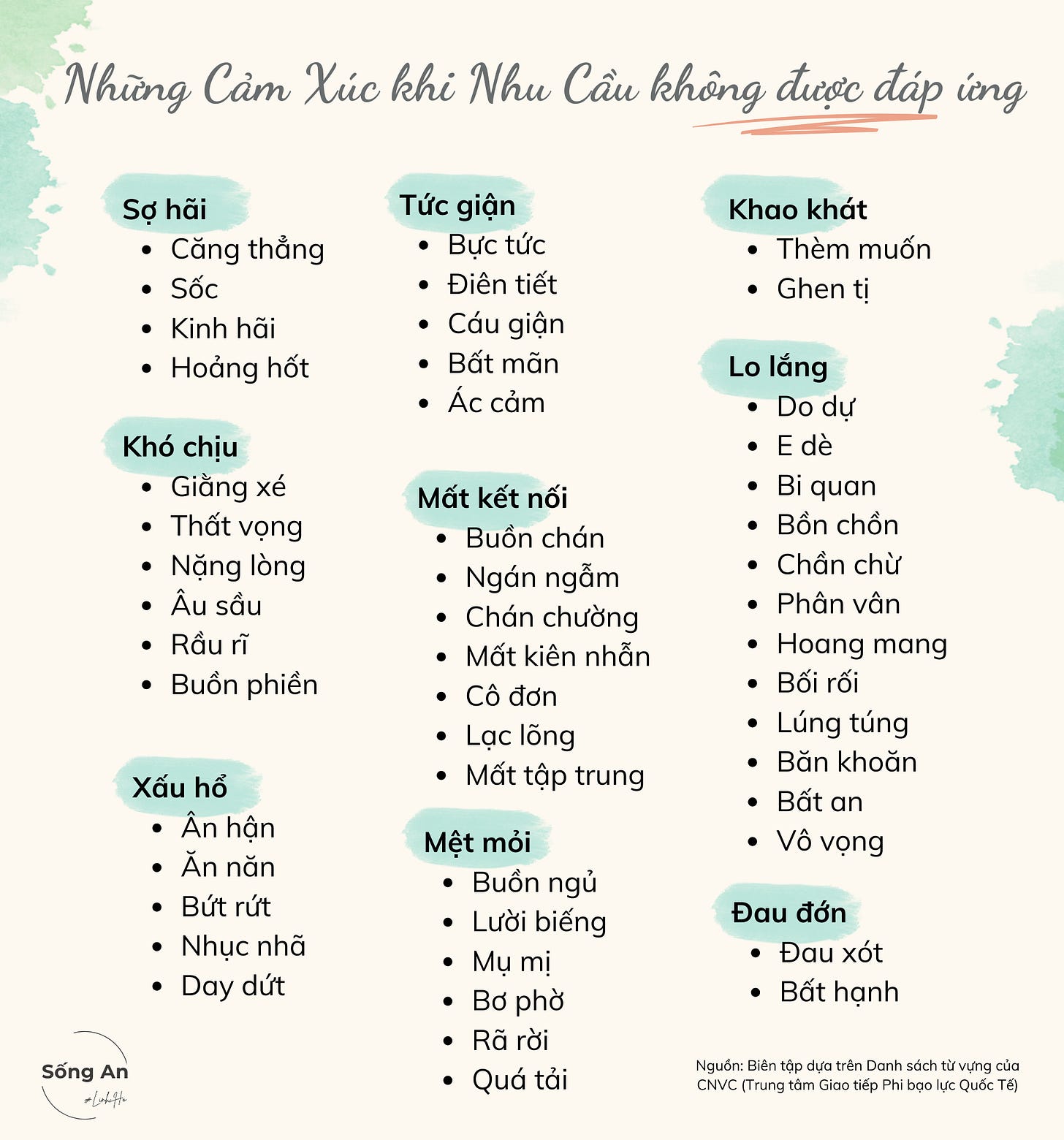 Trong NVC có rất nhiều cách gọi tên và phân loại cảm xúc và nhu cầu. Danh sách mình chia sẻ chỉ mang tính chất tham khảo và mỗi người đều có thể tự xây dựng bộ từ vựng của riêng mình nhé. Những hãy chú ý rằng khi xác định những cảm xúc, đừng xen lẫn vào trong đó những phán xét về hành vi của người khác, ví dụ như: Tôi cảm thấy bị bỏ rơi hay bị phản bội, bị hiểu lầm, bị thao túng, bị phán xét. Nếu hành động, lời nói của ai đó làm bạn đau lòng, hãy chỉ nói rằng bạn đang đau lòng và buồn bã. Đừng đánh giá, suy đoán ý định của người khác một cách tiêu cực. Phán xét người khác theo cách này là cách hiệu quả nhất để bạn sẽ KHÔNG ĐẠT ĐƯỢC điều mà mình muốn.